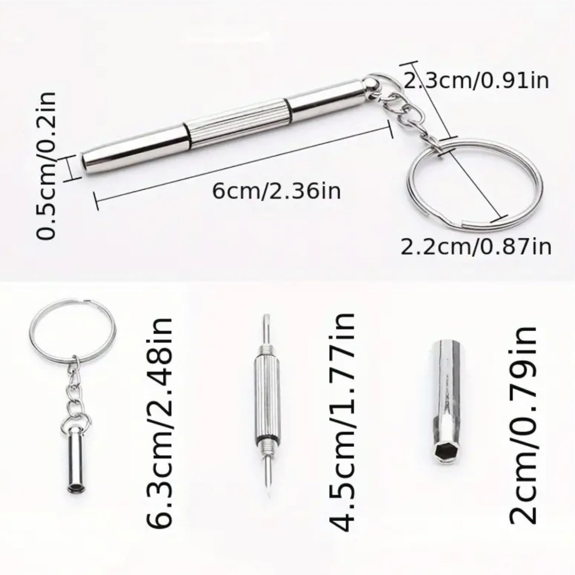 This compact and portable multi-function tool is an essential accessory for anyone who wears glasses, sunglasses, or watches. Crafted from high-quality metal, it offers exceptional durability and strength. The reversible flat and hexagonal heads allow for precise adjustments and repairs on a variety of optical, electronic, mobile phone, and watch applications. With its convenient keychain design, you can carry it with you wherever you go. This versatile screwdriver kit is a must-have for quick and easy fixes on the go. Its compact size and practical design make it an indispensable tool for maintaining your eyewear and timepieces in pristine condition.