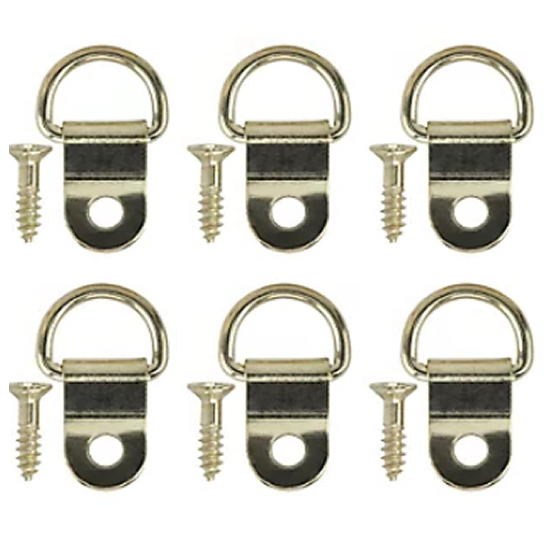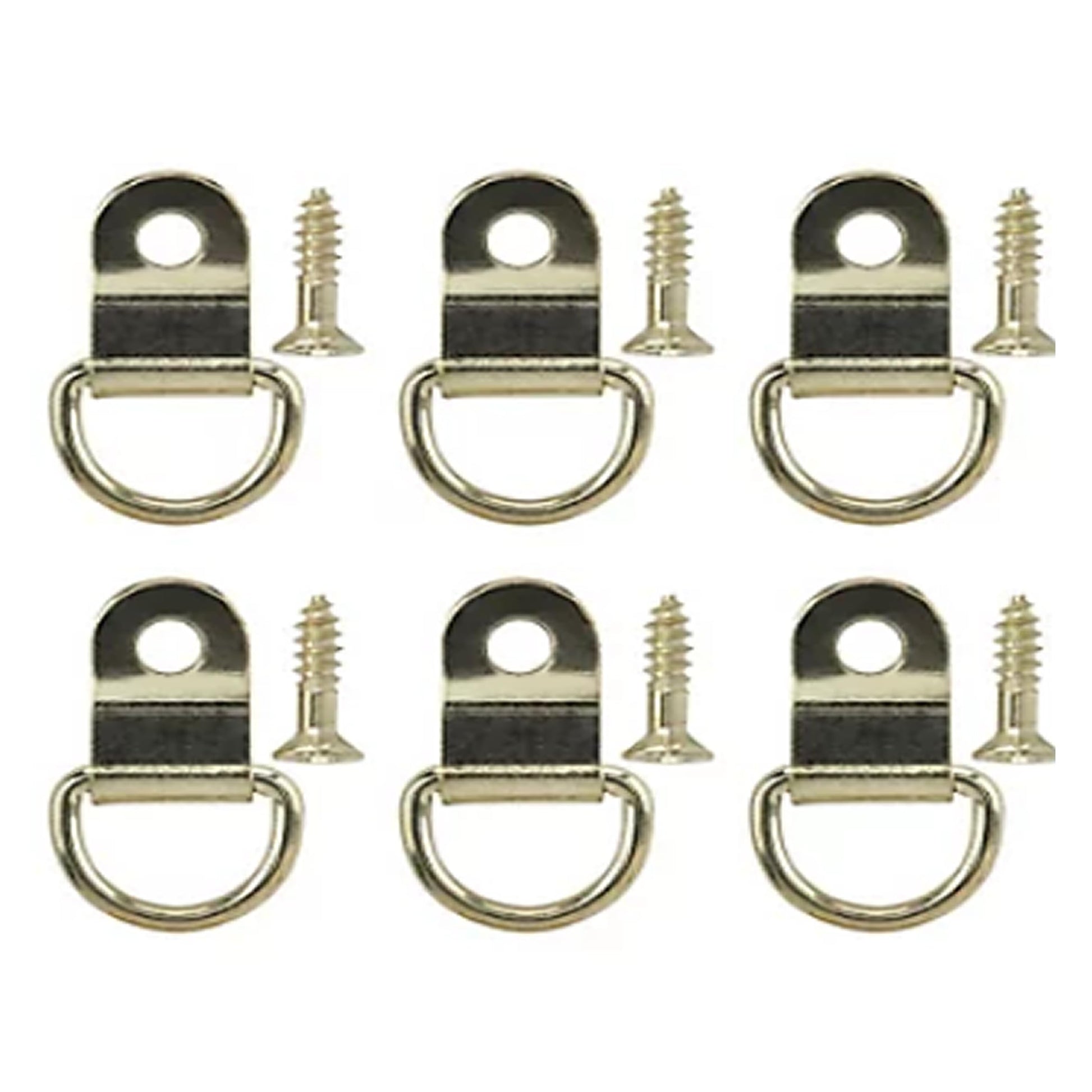 Effortlessly hang your artwork, photographs, or decorative pieces with this pack of six sturdy picture hooks. Crafted from brass-plated steel, these durable and rust-resistant hooks are designed to withstand the test of time. Each hook measures 25 x 15 mm and comes with a screw for secure mounting. Whether you're displaying a cherished family portrait, a vibrant canvas painting, or a decorative mirror, these versatile hooks provide a reliable solution. Simply attach them to the wall, and hang your desired item using cord or wire through the D-ring. With their user-friendly design and robust construction, these picture hooks offer a hassle-free way to transform your living spaces into personalised galleries.